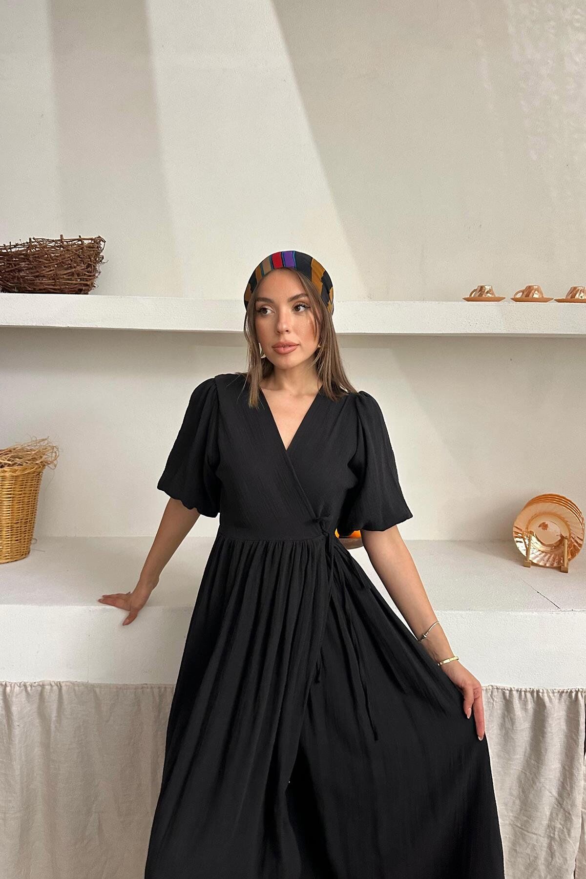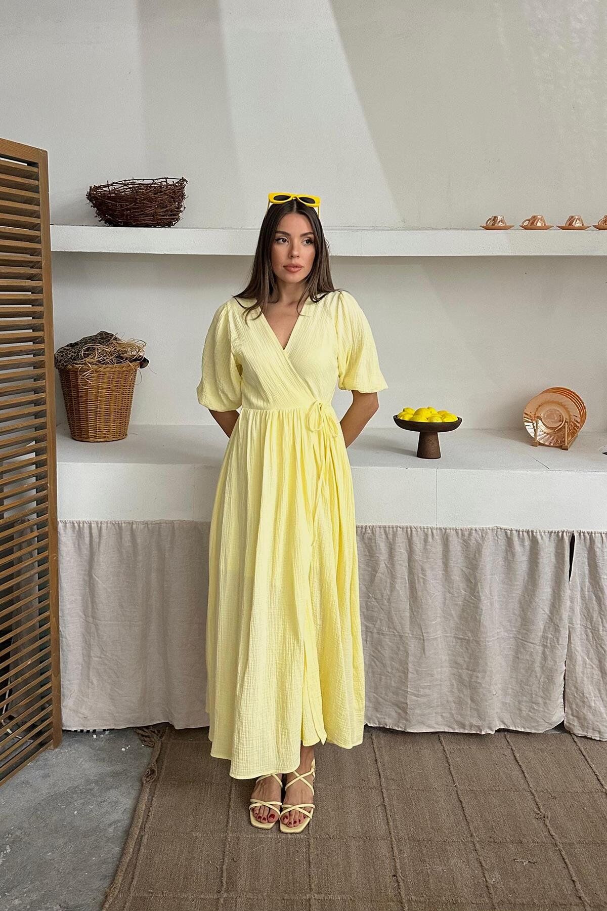 Bu elbise rahat ve şık bir tarza sahip. Pamuklu muslin kumaştan yapılmış olan bu uzun elbise, yaz aylarında rahatlıkla giyilebilir. Zarif ve hafif yapısıyla, herhangi bir günlük veya özel etkinlik için mükemmel bir seçenek.